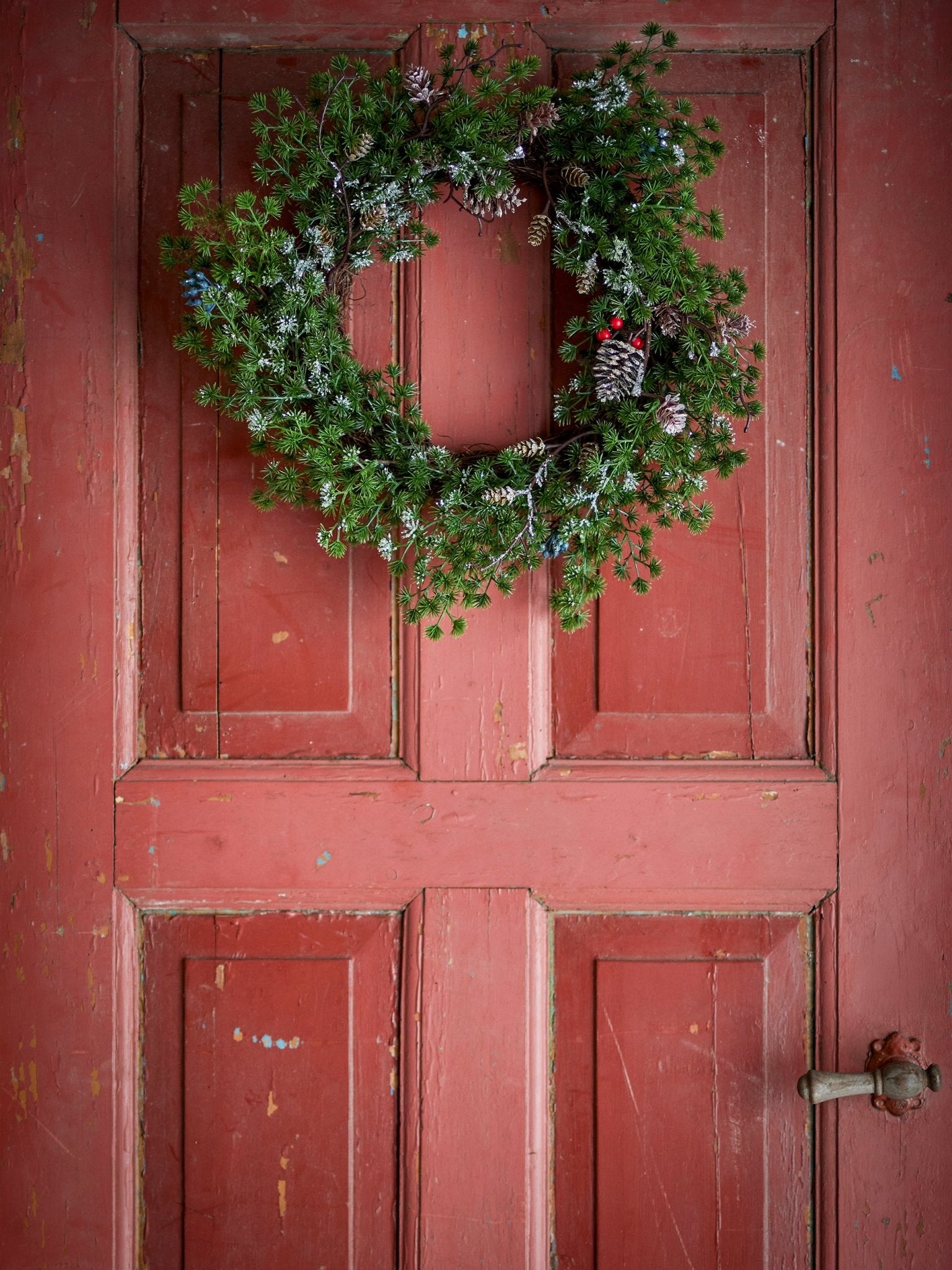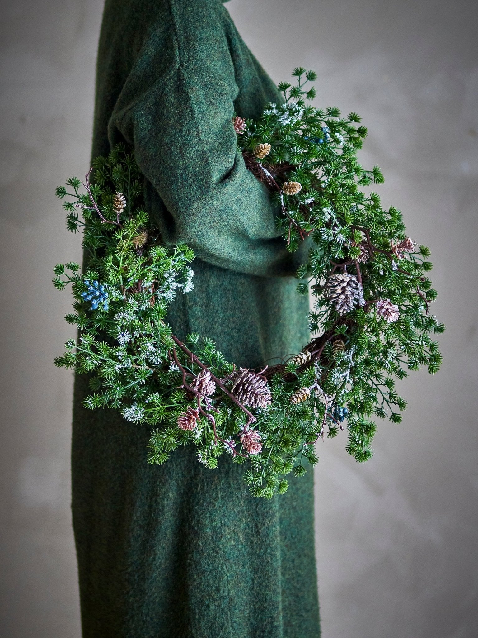 The Cedar Wreath by Bloomingville consists of artificial spruce branches and decorative cones, bringing holiday spirit to any room. Adorned with silver glitter, it creates a festive atmosphere without the need for maintenance. This makes it a practical and charming addition to your home during the holiday season. The wreath is ideal for hanging on the front door or as a stylish wall decoration.