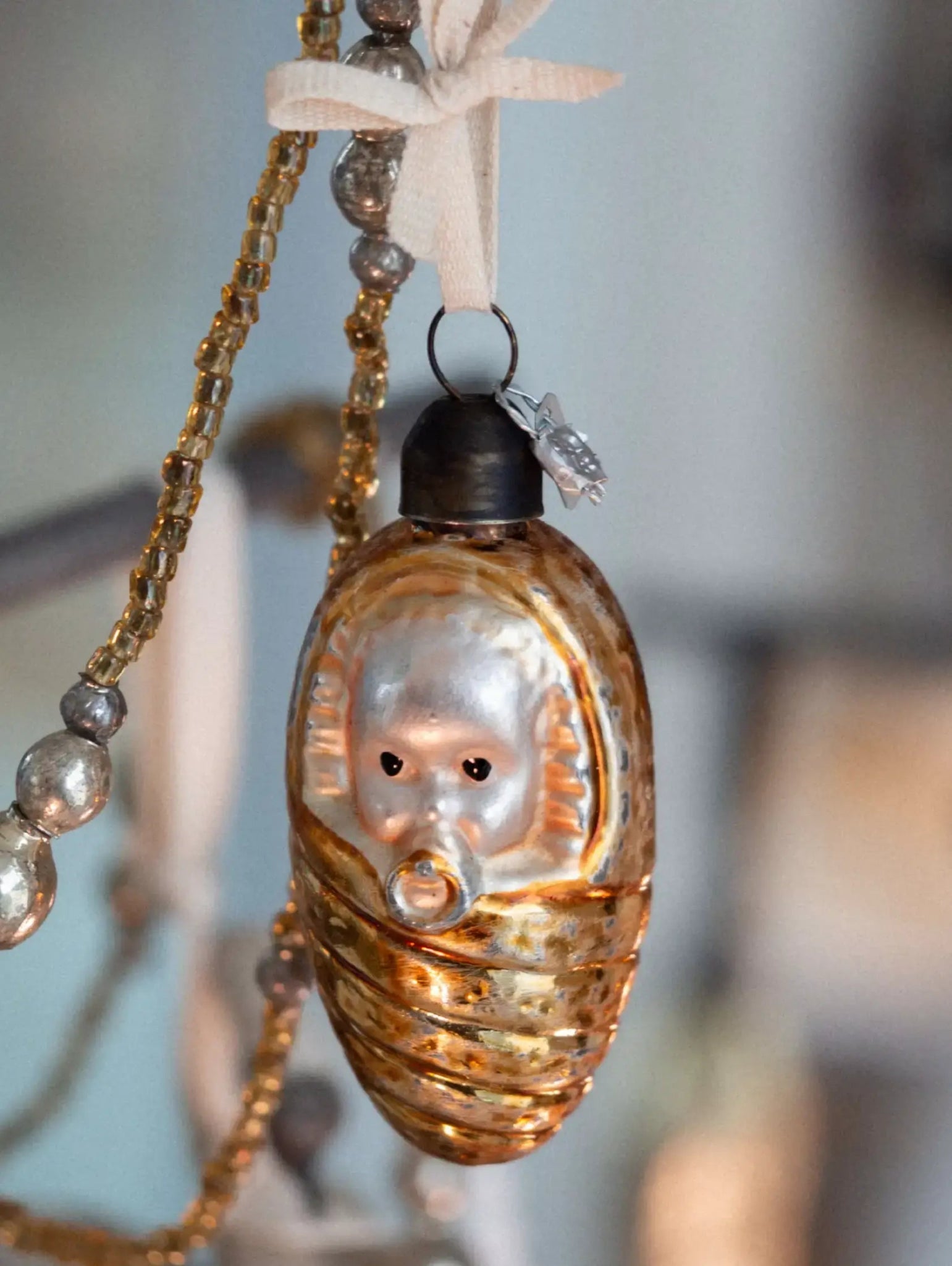 Vintage swaddled baby glass ornament with pacifier