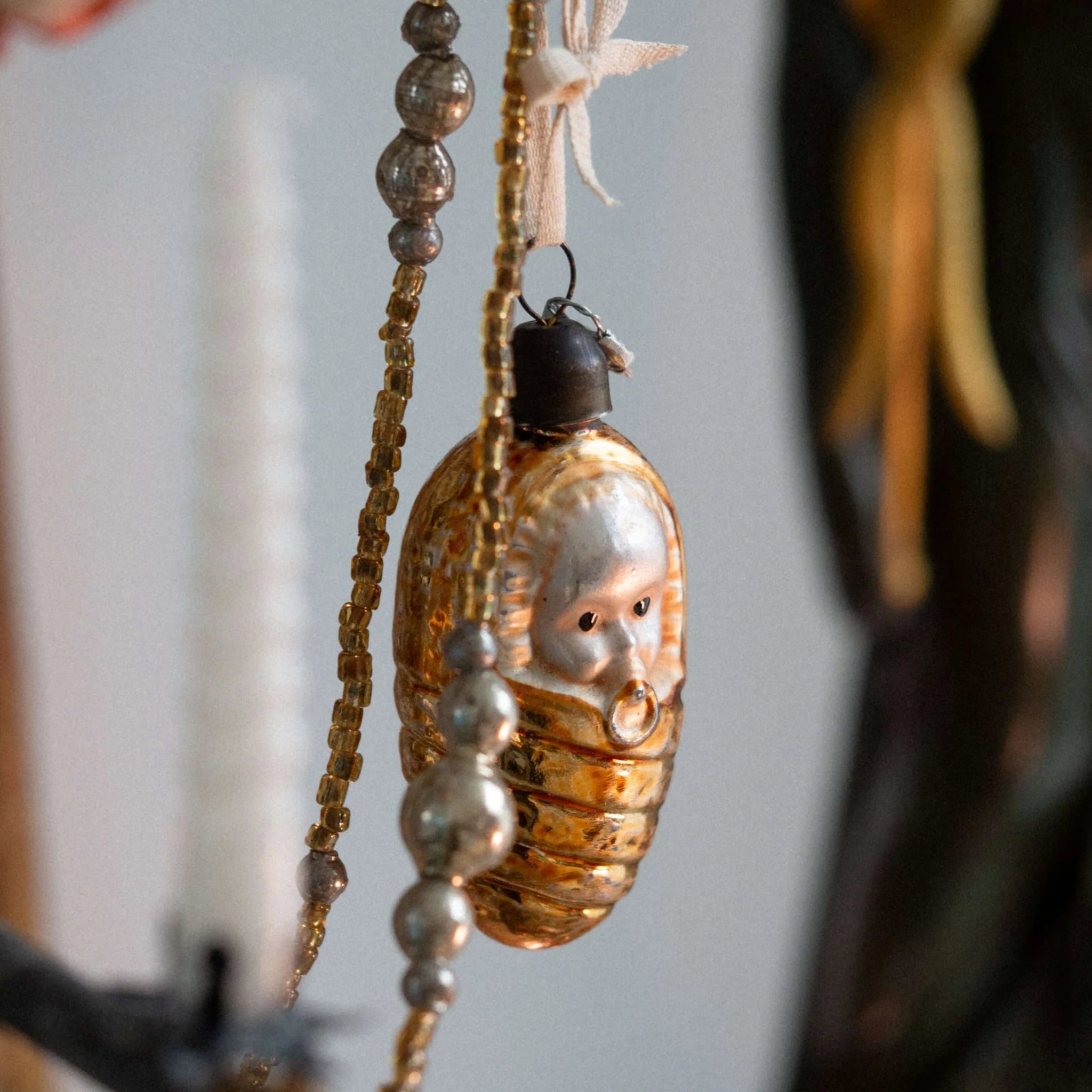This stunning ornament is a faithful recreation of a classic German ornament from the 1920s. Mouth-blown and hand-painted, it is crafted with meticulous attention to detail. The ornament features a mercury silver interior, while the exterior is adorned with a golden swaddle wrapped around the baby, who holds a tiny Nuggi (pacifier). Every detail has been faithfully replicated from the original ornament, making it a perfect piece for collectors and those who appreciate traditional holiday décor and fine craftsmanship.